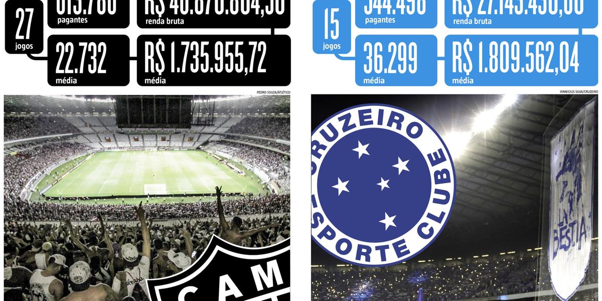 Essa diferença se deve ao fator Mineirão, pois a média de público cruzeirense (36.299) é mais que um Independência e meio. Já a do Atlético, mesmo com quatro dos 27 jogos disputados no Mineirão, é de 22.732.