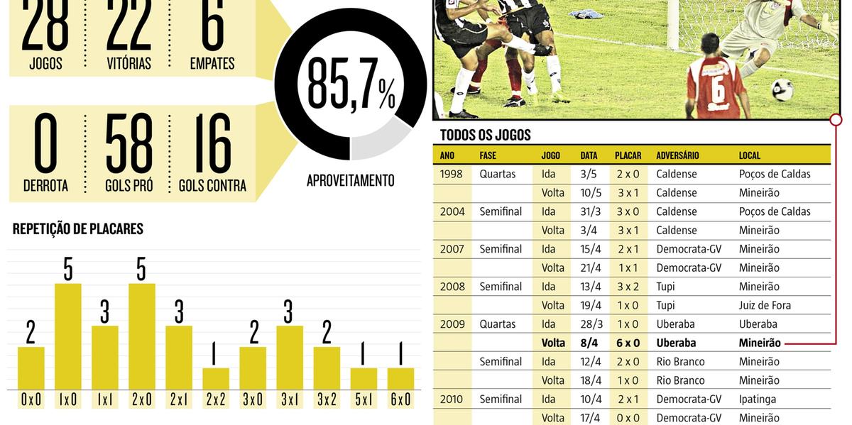 No ano seguinte, também nas quartas de final, mas diante da Caldense, o Atlético iniciava a dupla invencibilidade que defende a partir deste sábado, quando encara o Boa Esporte, às 18h, no Estádio Dilzon Melo, em Varginha, pelas semifinais do Módulo I do Campeonato Mineiro.