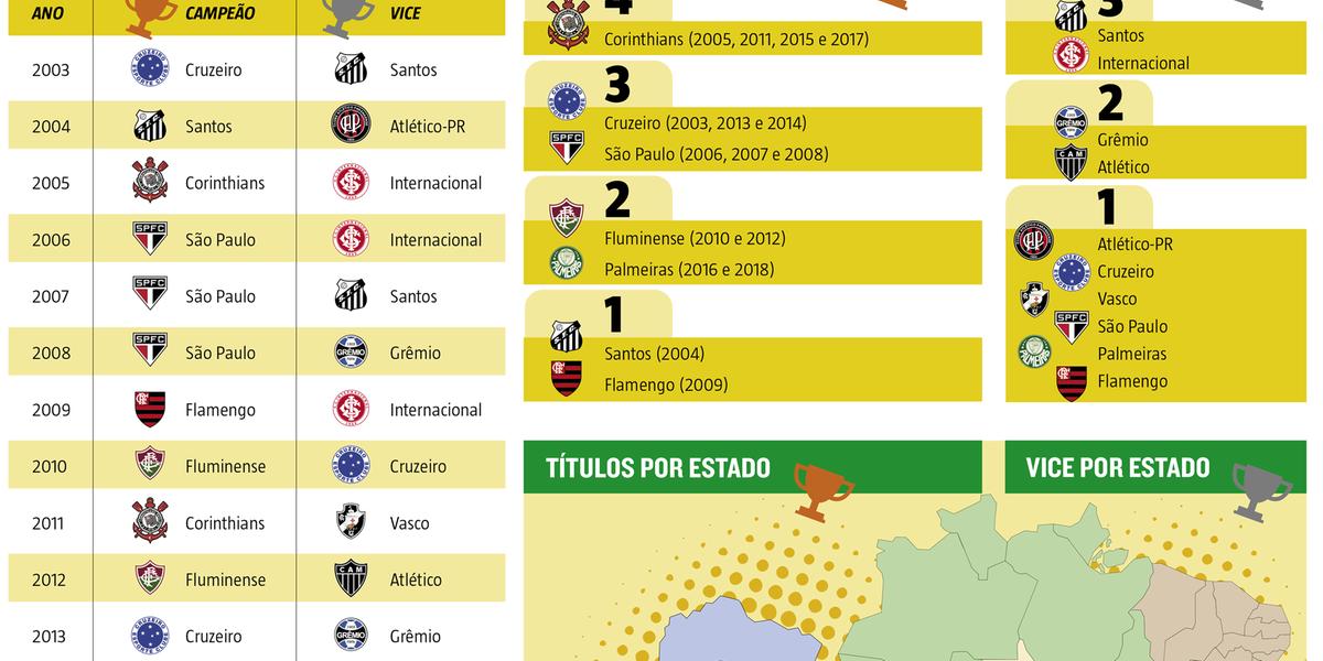Em 16 edições são agora dez títulos paulistas. Nas outras seis competições, Minas Gerais ficou com três taças, todas do Cruzeiro, e o Rio de Janeiro com outras três, sendo duas do Fluminense e uma do Flamengo.