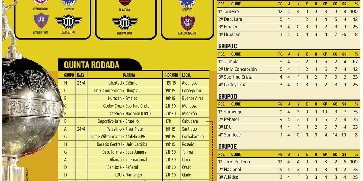 Dono da melhor campanha da fase de grupos da Libertadores 2019 até agora, pelo saldo de gols, o Cruzeiro tem os paraguaios Libertad e Cerro Porteño, também donos de um aproveitamento de 100%, na cola.