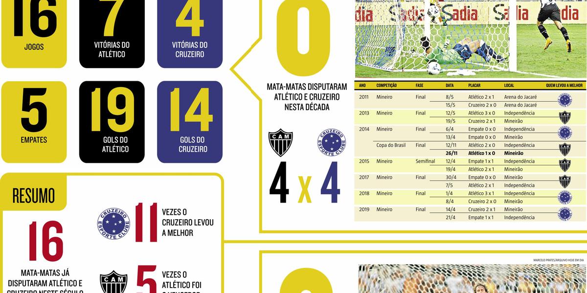 A igualdade nos mata-matas entre Atlético e Cruzeiro, a partir de 2011, contrasta com o que aconteceu na década passada, quando os dois rivais também se enfrentaram oito vezes em confrontos de ida e volta, sendo dois pela extinta Copa Sul-Minas e outros seis pelo Campeonato Mineiro.