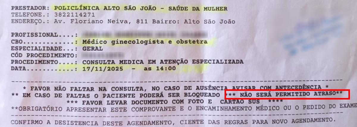 As reclamações em relação à falta de acesso à saúde e descumprimento das regras do SUS acontecem reiteradamente em diversas partes da cidade. No último dia 17 de novembro, foi a nossa vez de constatar ‘in loco’ mais uma falha da administração municipal. Desde o dia 2 de abril de 2025, aguardamos na fila por uma consulta especializada de ginecologista. Após 7 meses e 15 dias de espera, fomos avisadas da consulta na Policlínica Alto São João — Saúde da Mulher, marcada para as 14h do dia 17 de novembro. O documento traz a informação em negrito de que “não será permitido atraso”.